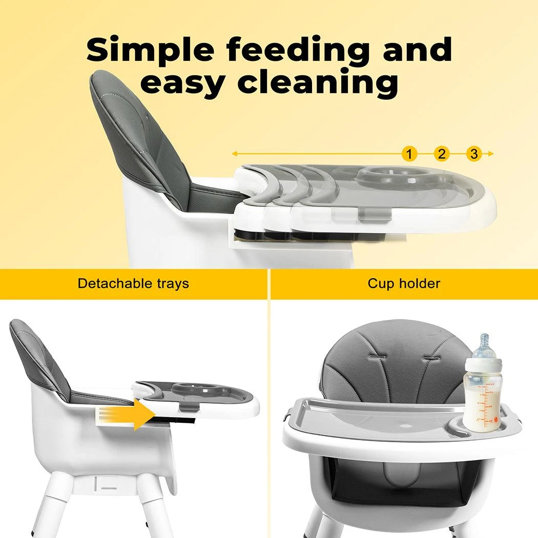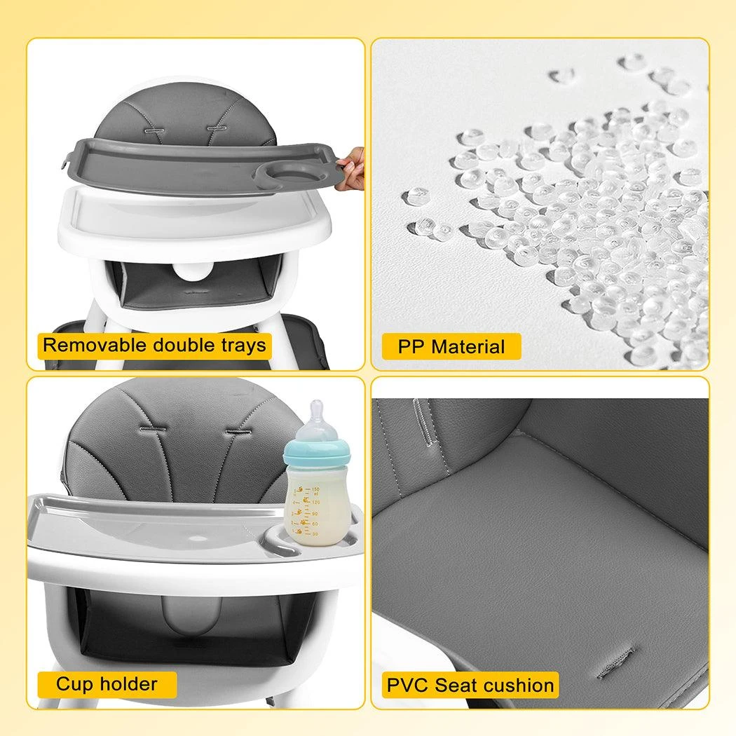 Comfort is key, featuring a breathable PVC seat cushion that is soft, waterproof, and easy to clean. The removable double trays allow for effortless feeding, with adjustable tray positions to suit your needs. The wide, food-grade PP tray makes mealtime simple—food can be placed directly on it and wipes clean easily. Plus, the deep cup holder makes accessing bottles and cups a breeze.