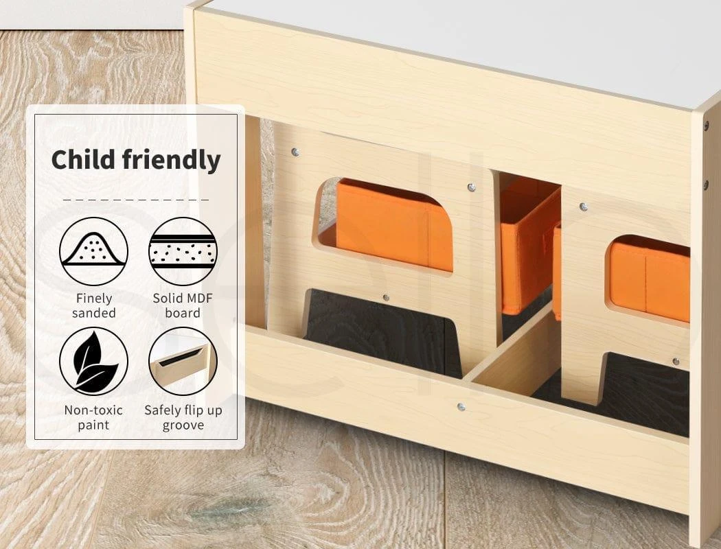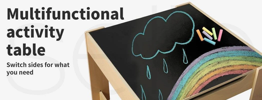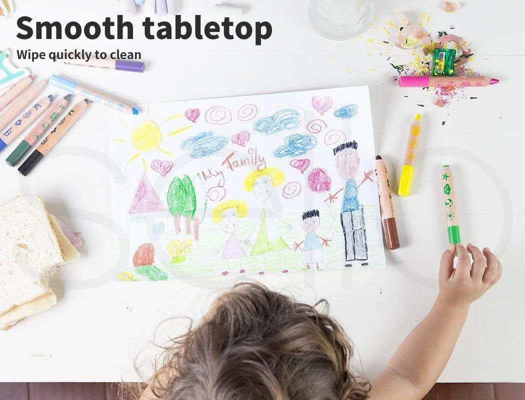Your child’s table because their very own canvas. Flip it over give them some chalk and watch them create art on the blackboard. Wipe it down with a wet cloth to clean it up or just flip it over.
