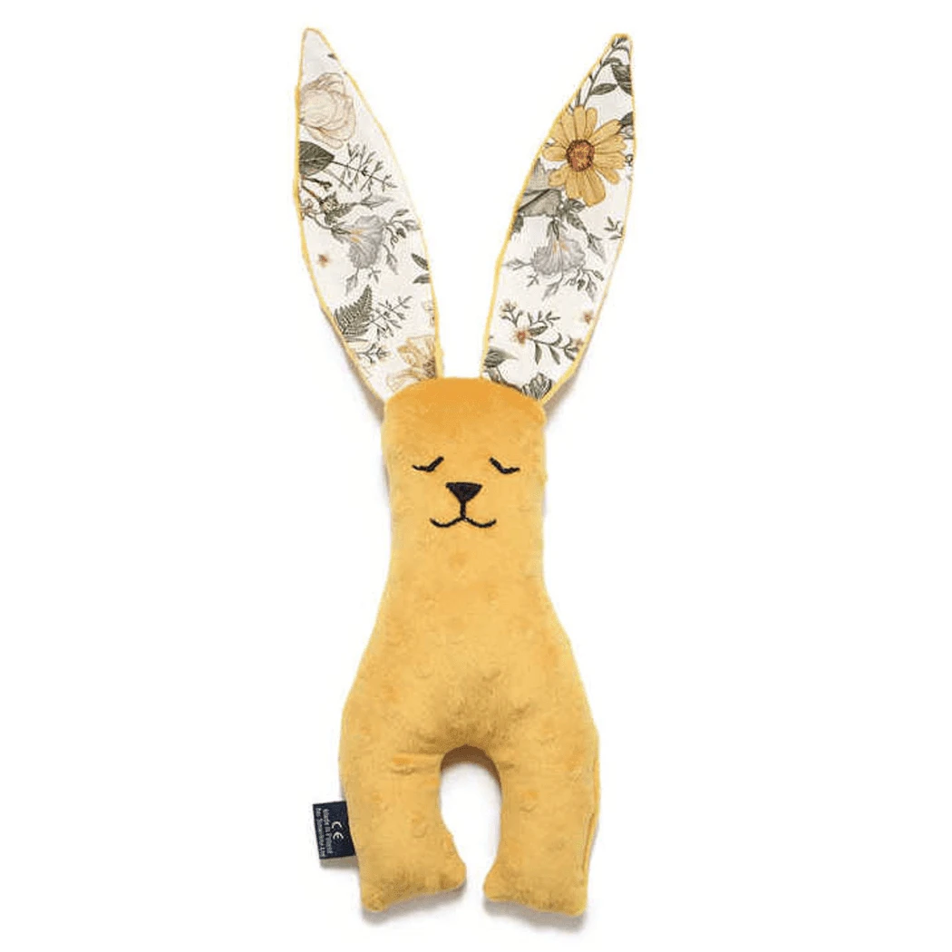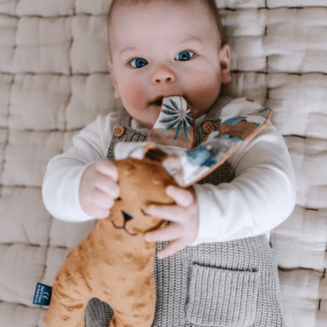 Soft cuddly, the perfect size to hold and cuddle while sleeping. Its waists are suitable for baby’s tiny hand enable practice in grabbing and stimulate their senses. Made with two types of fabric, starts with cotton and delicate plush and ends with ribbons to induce baby’s sensory developments.
