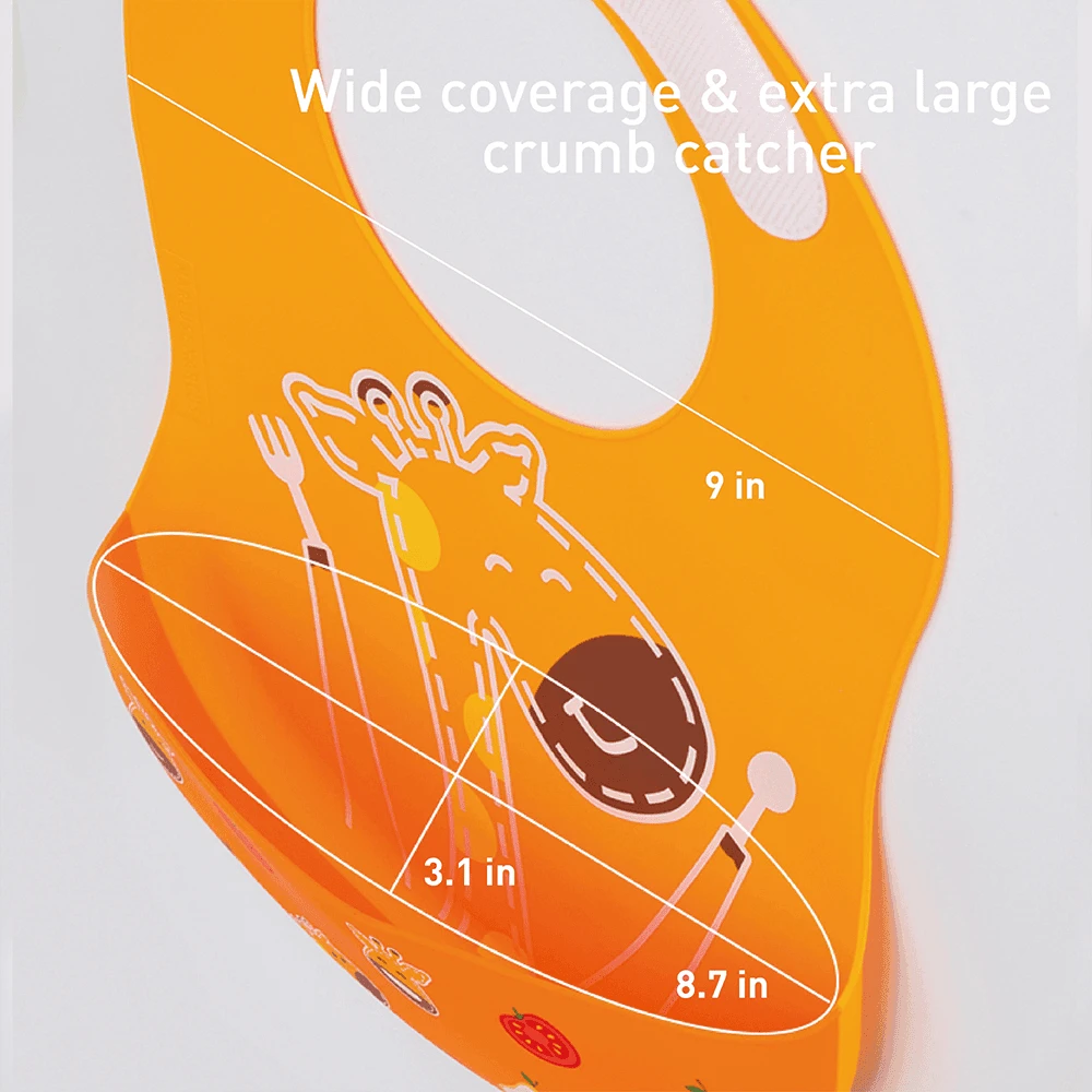 The extra large crumb catcher is big enough to keep the clothes stay clean and the wide shoulder design gives your little one more coverage from the neck down. The built-in velcro closure makes adjustment so convenient yet it stays securely on the baby. Our baby bibs are made from food grade, soft and stain resistant silicone. Simply wash it with soapy water and it is ready for the next meal