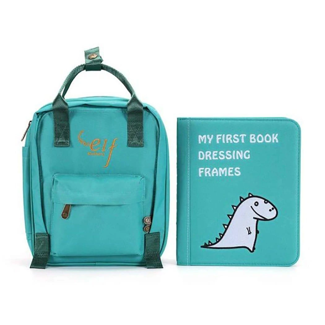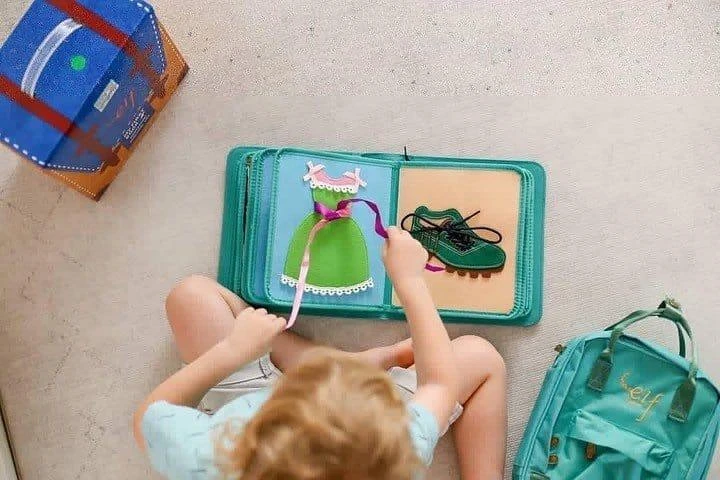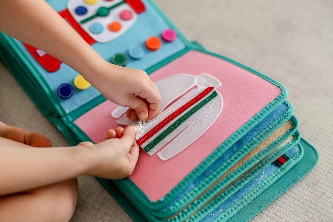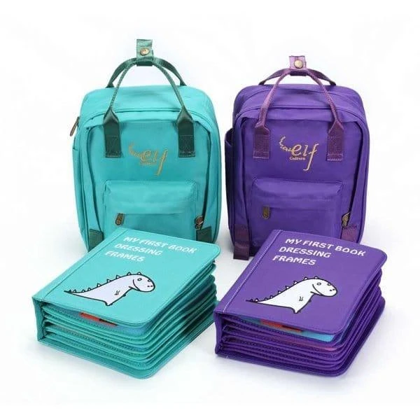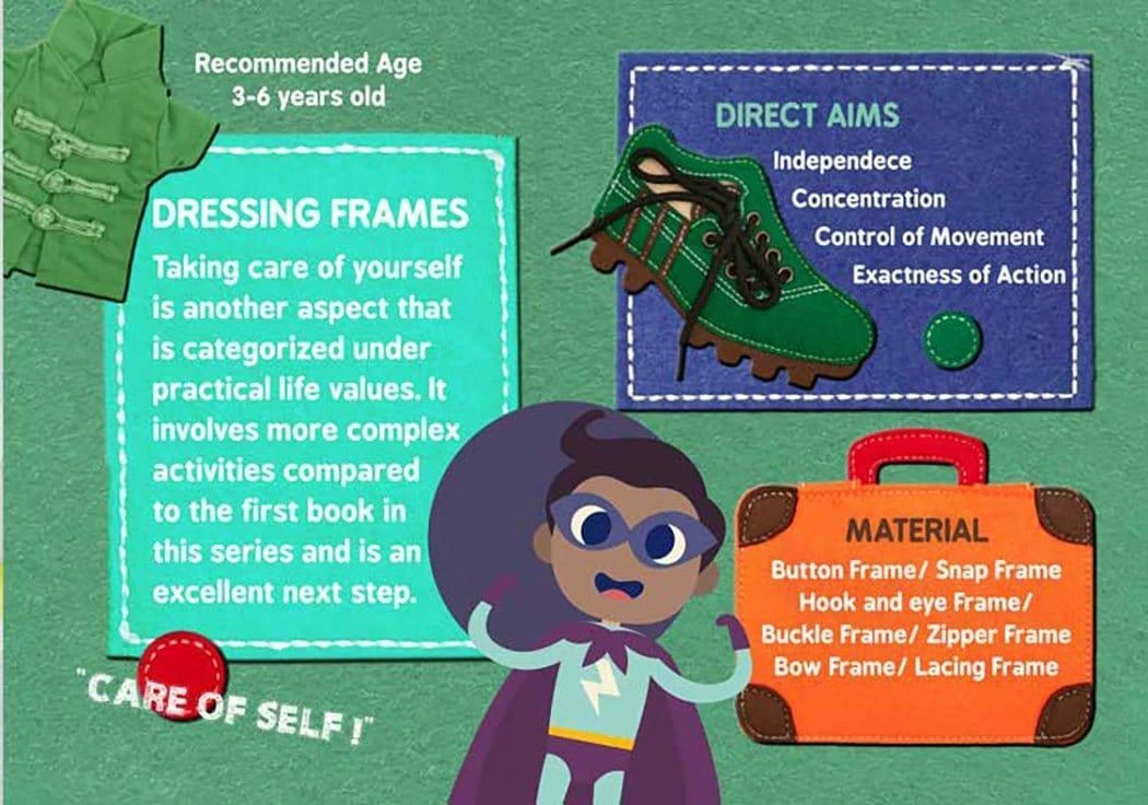 Dressing Frames,” a Montessori-inspired Busy book designed to support children in developing practical life skills. This baby book is the perfect next step for children aged 3-6, offering more complex activities to foster independence and self-care.