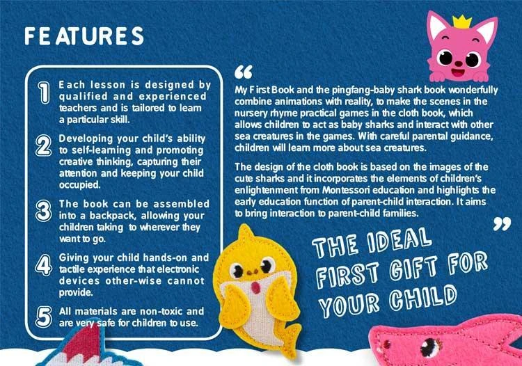 This interactive cloth book combines the beloved Baby Shark nursery rhyme with practical games, allowing children to immerse themselves in the underwater world and interact with the cute shark family and other sea creatures.