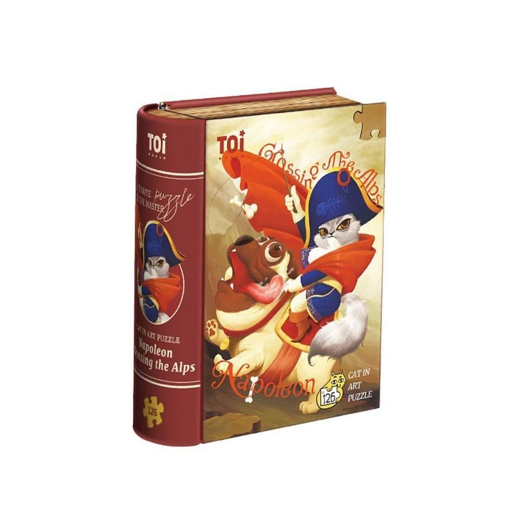 These puzzles come in their own little tin like book case. The high-spirited Napoleon is replaced by the image of a cat. In the picture, the cat rides on the back of a dog and conquers the dog with a fishing rod tied to a bone. Confidence and contentment shine from the cat’s face.